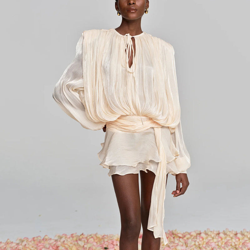 Feel elegant without trying too hard in a dress designed to move with you and enhance your natural beauty. The lace-up detail lets you adjust the waist for the perfect fit while adding a subtle touch of romance. Long sleeves offer graceful coverage, and the patchwork folds give the dress a soft texture and feminine flow. It’s polished, it’s breathable, and it’s perfect for everything from daywear to dinner dates—because true style should never come with compromise.